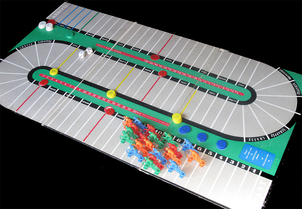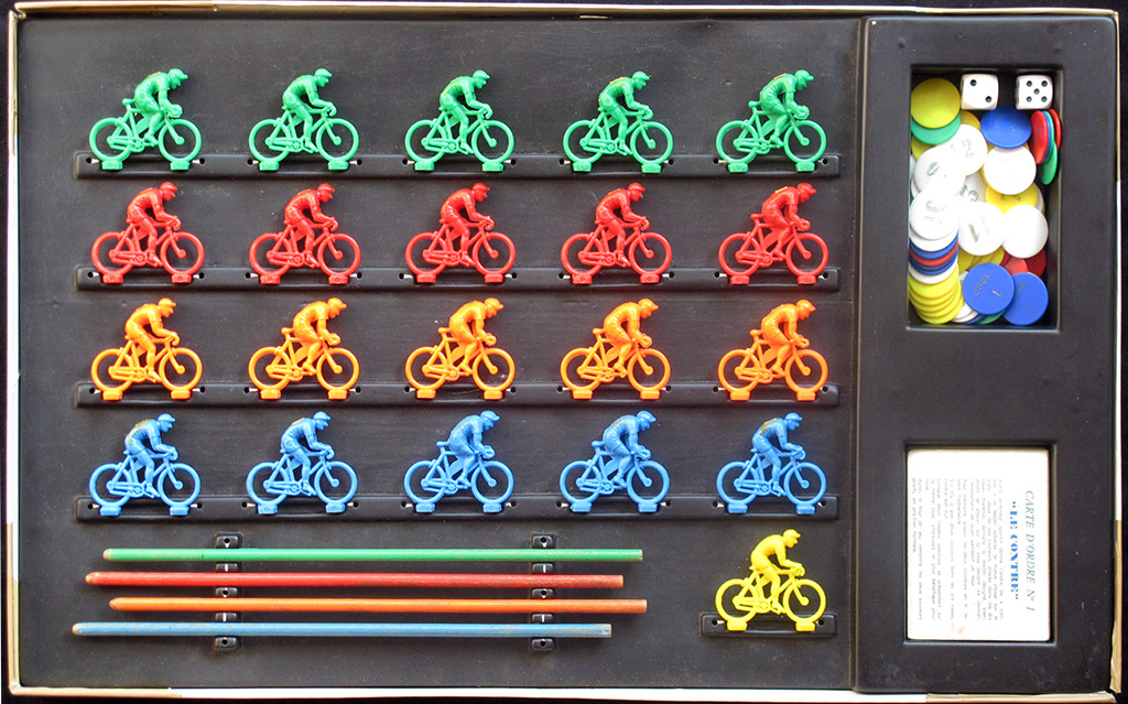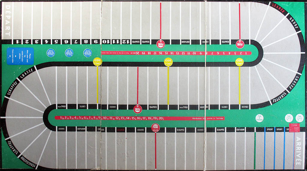 This game represents a stage race and can be played by 2, 3 or 4 people, though of course it is best with 4. The players must previously agree on the number of stages to be run. Since there is only one board, all the stages are similar. The aim of the game is to collect the most points, no matter which rider collects them. Points are awarded not only at the end of the stage, but also on the red ("prime") lines. Furthermore, there is a King of The mountains classification (yellow lines are mountain passes) which will give extra points at the end of the game. However, points are deducted from the team's total when riders falls on squares marked "PÉNALISATION".