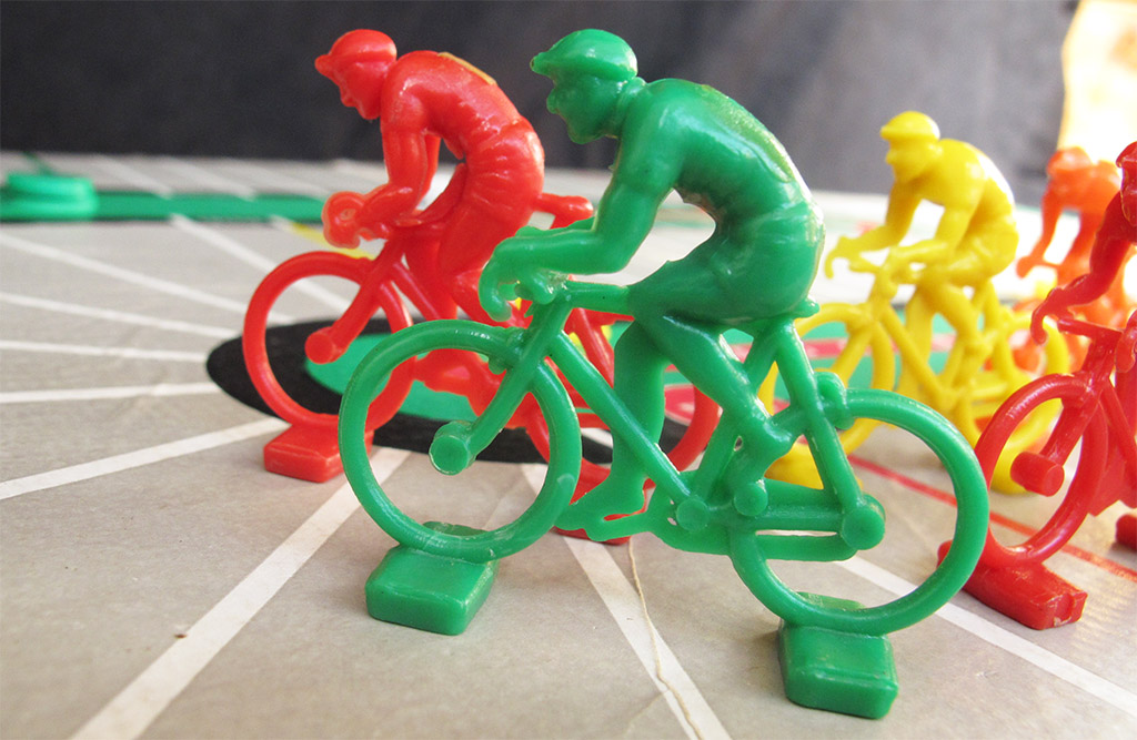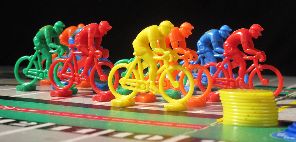 On the other hand, it is compulsory to move with at least one die the last rider in the race. What is worse, if a rider spends three consecutive game turns in the last position and is unable to overtake at least another rider, he is caught by the broom wagon and must leave the game. He will not take part in the following stages either. When the first rider crosses the finish line, the two last players in the race (indepoendently of which team they belong to) will also be eliminated if they are not able to cross the finish line in one throw (with two dice). Furthermore, some riders can be eliminated as a consequence of falls. A team that has less of three riders will not start the next stage(s).