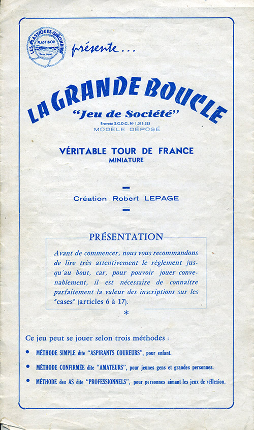 This is a rare French game of which I have never seen another copy. The game was made in Bordeaux and patented in Bordeaux,and probably was only distributed there, although the previous owner told me that he has never seen another copy either, despite living in Bordeaux for many years. ALthough there is a name of a manufacturer (Plastibor), I have never seen another game byhim, so (until proven otherwise) I am including the game in the self-published games category.
