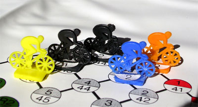 Unusual game from the late Geert Lagrou's collection. One wonders if a plastic board is the best solution play a cycling game. The riders are moved by cards (instead of dice), as in games like L'Échapée (Der Ausreisser) or Tafel Tour, which is always a feature I like. In fact, this game looks like a Tafel Tour adaptation, as far as I can tell.