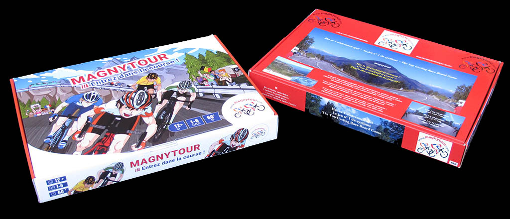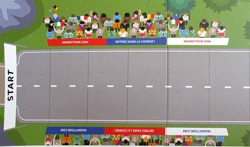 With Magnytour you can play either a single race or a stage race. The estimated time play on the box (60 minutes) is the time you need to play one race or stage, but there are rules to play a full stage race over different sessions. Unusually, the time gaps depend on the type of stage: a square represents a 10s gap in a flat stage or a 15 s gap in a mountain stage. There are also rules for time trials.