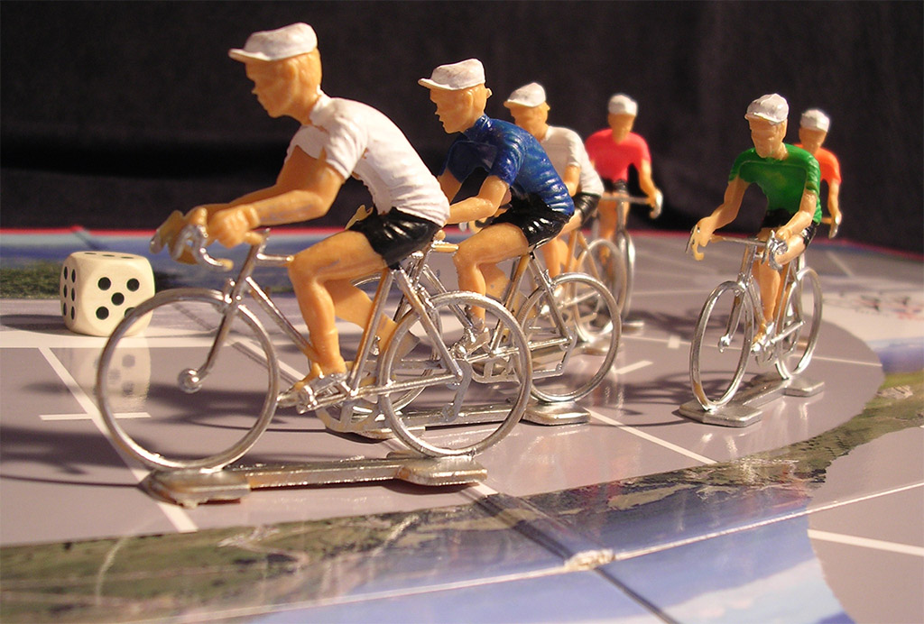In the rules booklet we find 14 different stage profiles, and 3 somewhat simplified grand tours (Tour, Giro, Vuelta). Of course you can make your own stage profiles, or purchase more at the game's online shop.In his turn, a rider can choose between throwing the dice or, under certain conditions, follow the rider ahead under an aspiration rule.