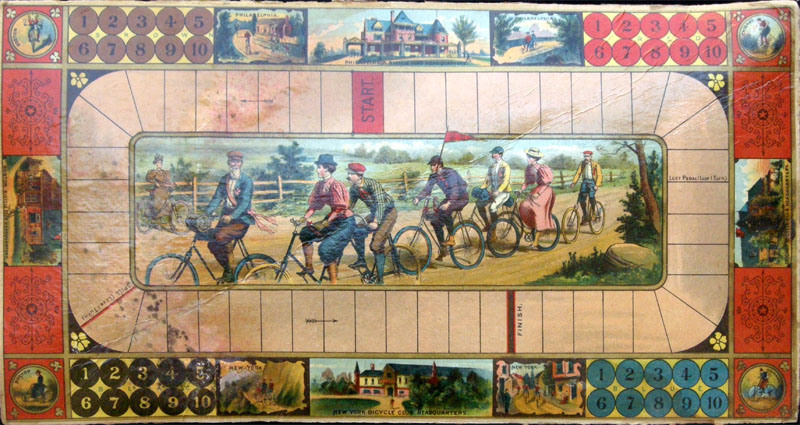 This game is quite similar to the McLoughlin's 1891 classic Bicycle Race. Though there are at least two other games by McLoughlin with similar titles documented (Game Of Bicycle Race, 1895, and Bicycle Racing, 1900), this one seems to have been overlooked by historians (probably mistaken for his classic "older brother").