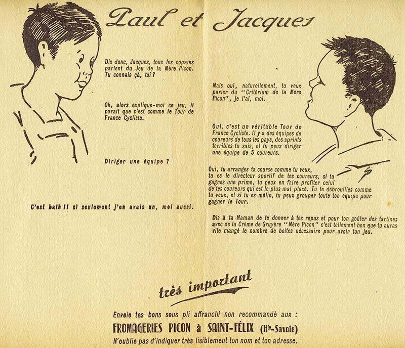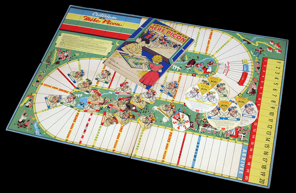 Regarding the game, she told me that Mère Picon (who were quite involved in advertising goodies as card games or blotters) asked Jacquet to make a game inspired by the Criterium du Dauphiné, since the race (created in 1947 created by the newspaper Le Dauphiné Libéré) passed not far from the headquarters of La Mère Picon in Saint Félix (and arrived in Grenoble).