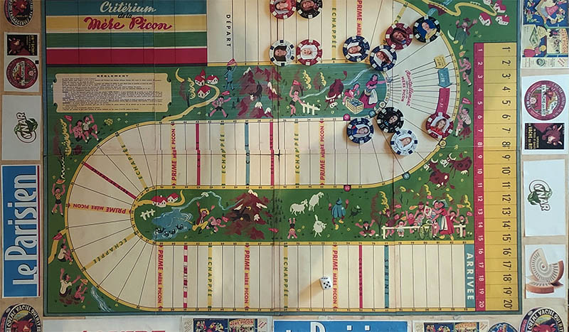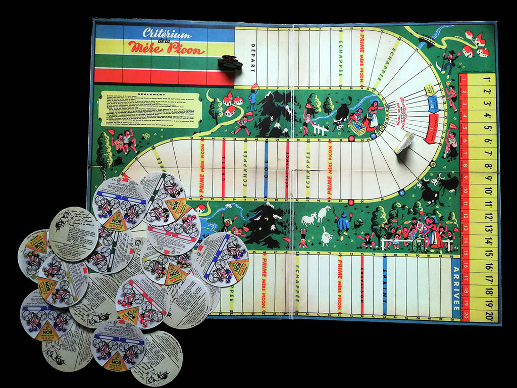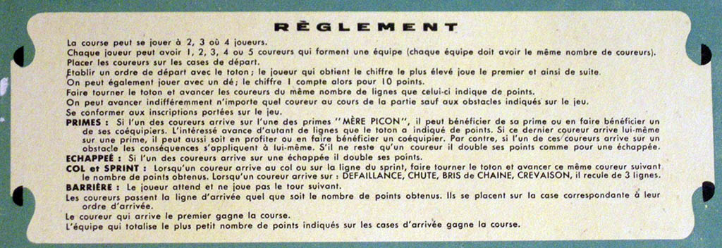 This fantastic game was a promotion for the "Mère Picon" cheese, made by Fromageries Picon, which were based in St Felix (Haute Savoie) and are now part of the Bel Group. Each cheese box included a cut-up rider and a bonus. If you sent 20 of these bonuses, you received the board. Therefore, this game did not have a box , but it is still fantastic. It made it to my favourite games list as soon as I had it in my hands.