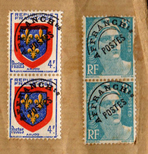 The stamps on the envelope are interesting since they help to date the game. I had previously written it was "from the 1950s", but maybe now I can be more precise. The Anjou coat of arms 4F stamp with the Anjou coat of arms is from 1949, and was available until 1951 (depending on which website you check. Some say it was withdrawn from sale in 1949). The Marianne de Gandon 8F stamp was sold between 1948 and 1954. Both stamps seem to have been sold mostly in the year 1949.