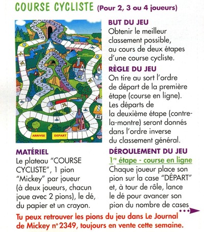 Another game on a French children's magazine. This one was included in the june 1997 issue of Journal de Mickey (number 2350). The magazine, as is usual in summer issues, included some other unrelated gamen. The counters for these games (as well as more games) were included with the previous magazine (number 2349). However, I have seen these counters and they are just cut-up Mickey Mouse characters, with no relation to cycling whatsoever. So I do not bother to look for them (my completism has a limit).