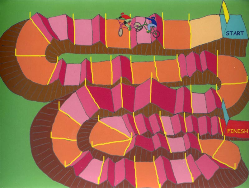 This is the Quikky Games BMX game. There are two editions of the game, named "SLIM" and "POKKET". The rules for the smaller "POKKET" game are a simplified version of the already simple rules for the bigger "SLIM" game.