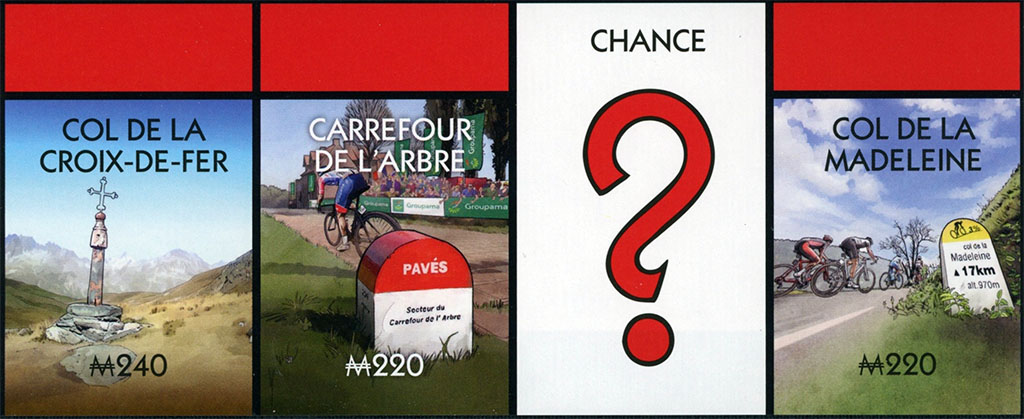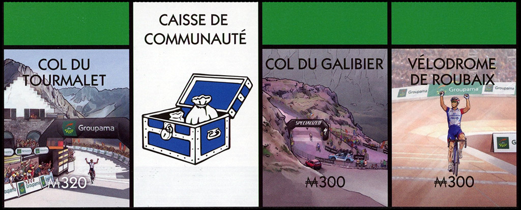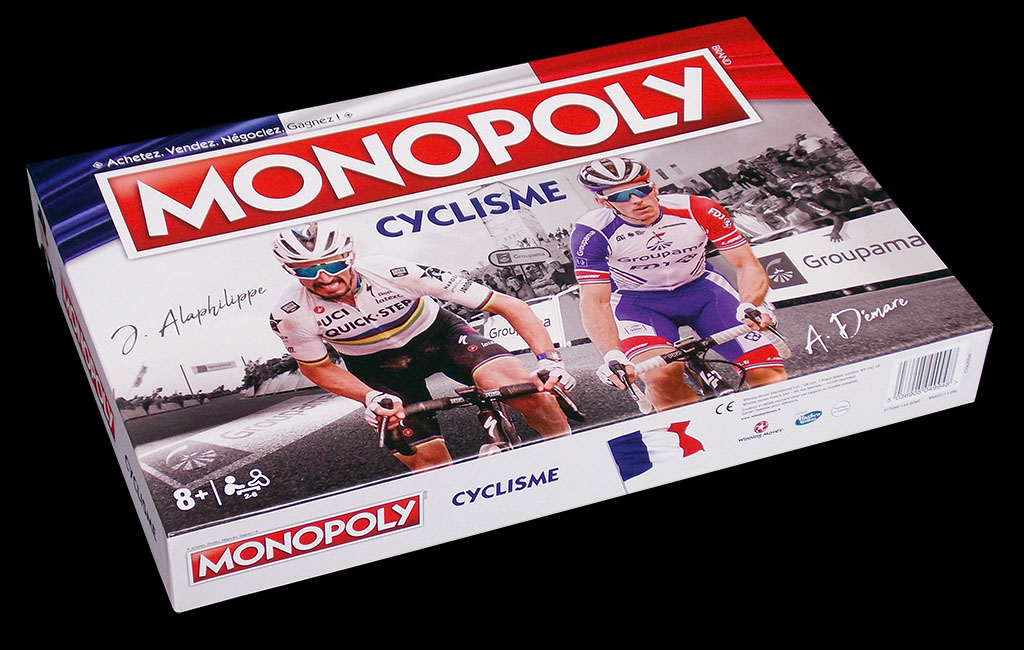 The cycling-themed game of Monopoly released last year must have been a success, since here we have a new version aimed at the French market. This game has been released by the same (Belgian) group, though this time in partnership with Groupama, and is very similar to the other (same size, same materials...). You may want to refer to the Monopoly Koers description for the details. The main difference is that, in this game, what you sell and trade are spots related to French cycling races, including, but not limited to, the Tour de France. And that the rules of this one are only in French.