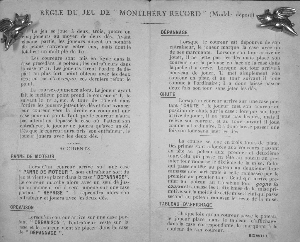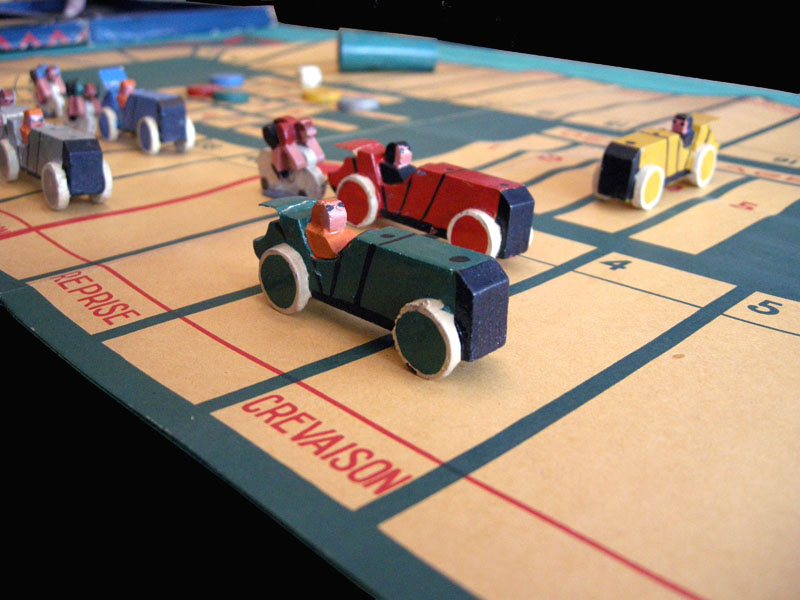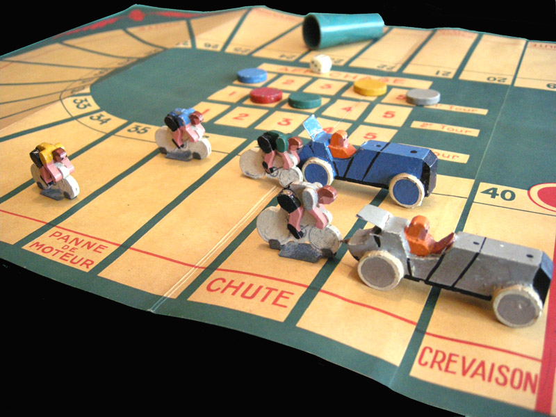 Unfortunately we do not have the rules of the game. All we know is that there are 5 teams composed of a car and a rider, one wooden counter per team, and that the game is played with a (single?) die.