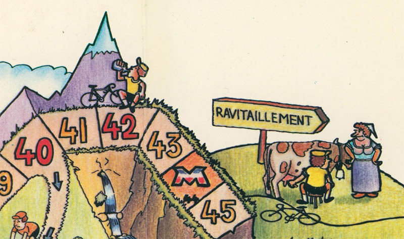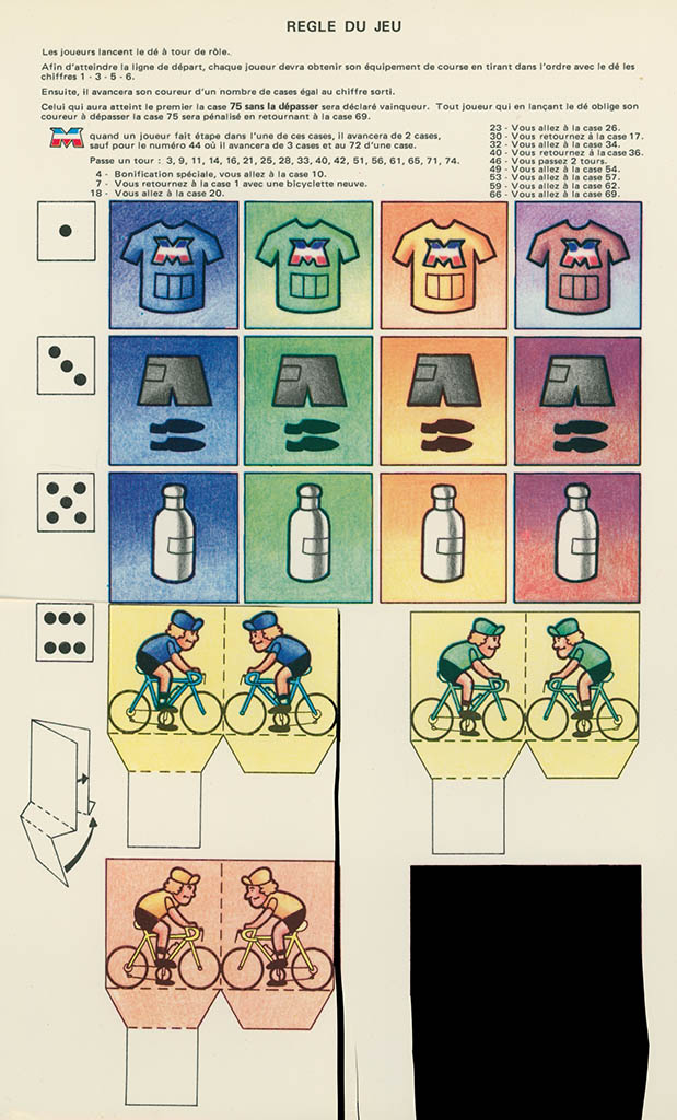 This is a game issued by Cycles Motobecane in 1979 as a souvenir of the "assemblée générale ordinaire des actionnaires". I assume it was offered to Motobécane shareholders who attended to meeting, along with an eight-page booklet featuring vintage cycling images. I do not know how many copies were printed, but I guess most of them were either given away to kids who destroyed them by use (the game is not really meant to last) or simply forgotten in a drawer. This makes the game quite hard to find nowadays.