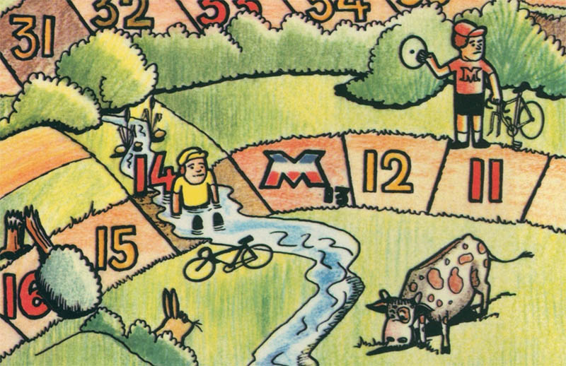 Of course it is a roll-and-move game (one in which players do not have any strategic choice), but the starting rule is quite unusual. Players cannot start the race as long as they have not rolled 1, 3, 5, and 6, in that order, to "get their equipment". You would then expect the riders to be handed the equipment (jersey, pants, bottle, and finally bicycle), as it looks like the squares with these parts can be cut up, and there is no other use for them. You might even expect the equipment (at least the bottle) to be used in some race incidents, as, say, in games like Wheeling or Cycling. But none of this is mentioned in the rules.