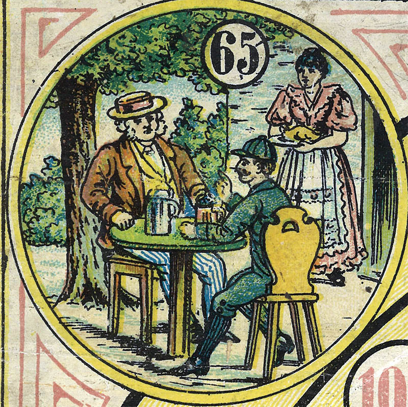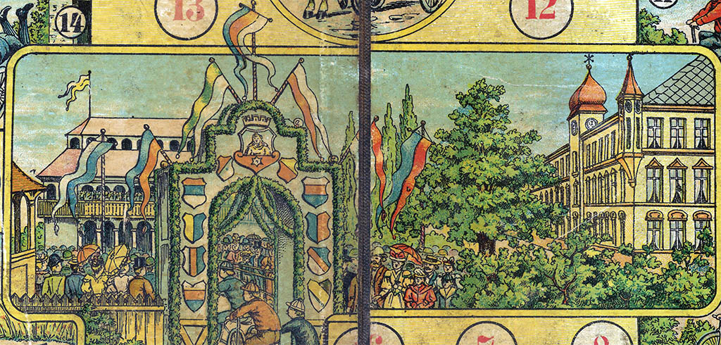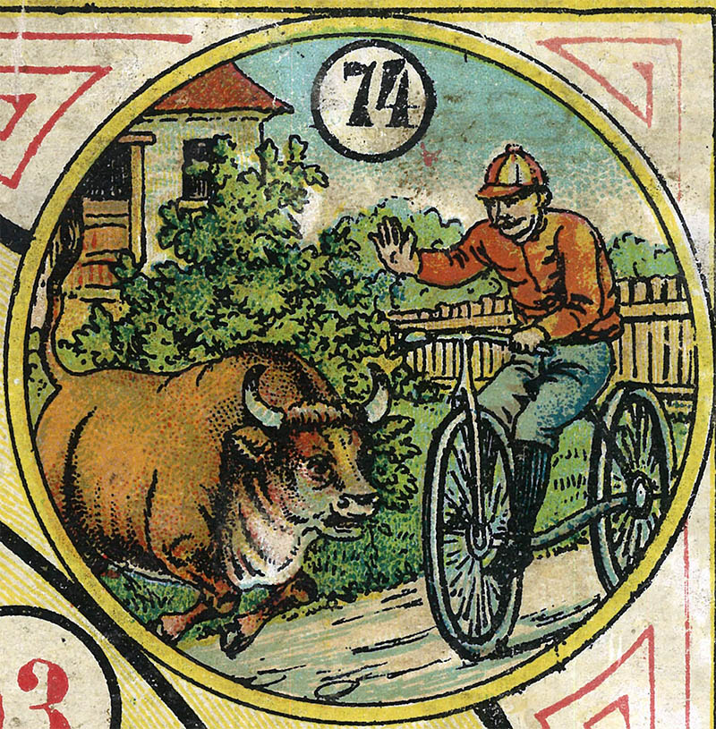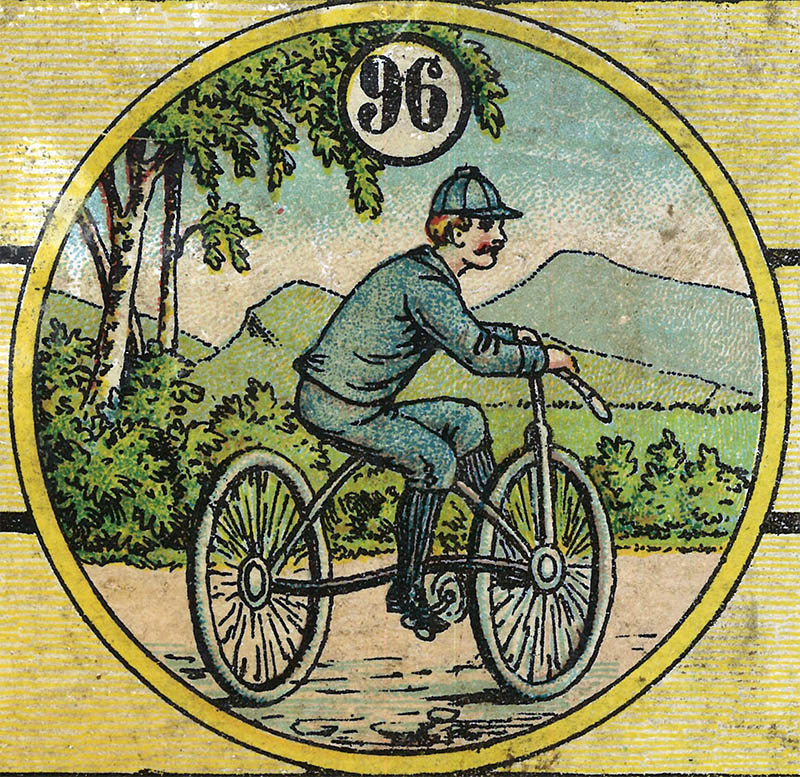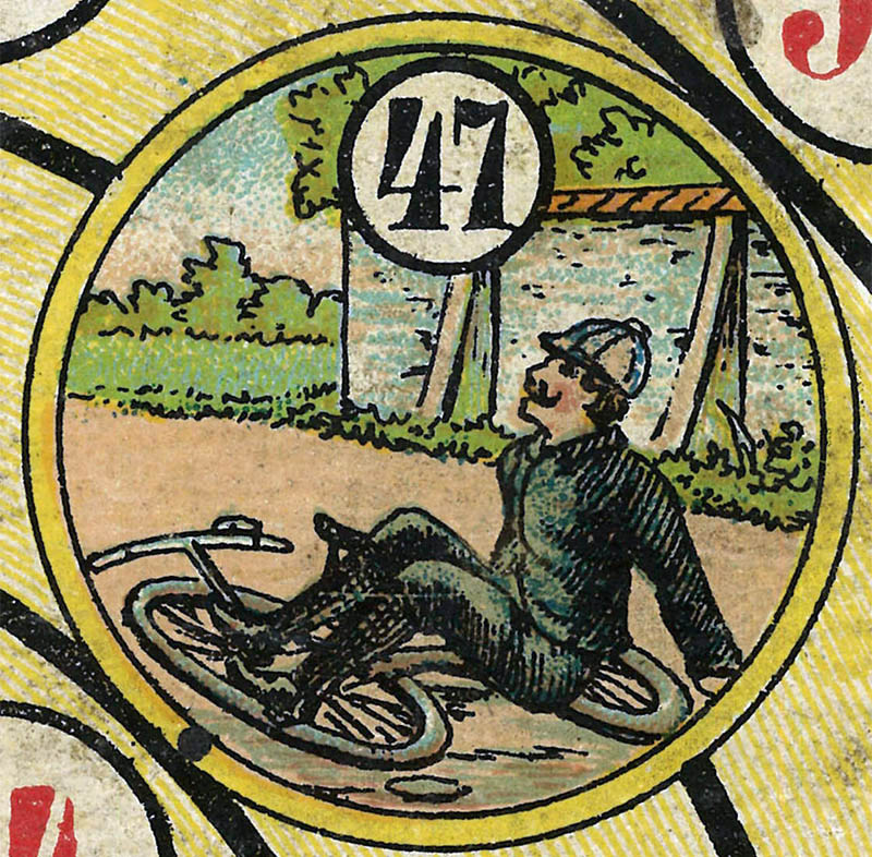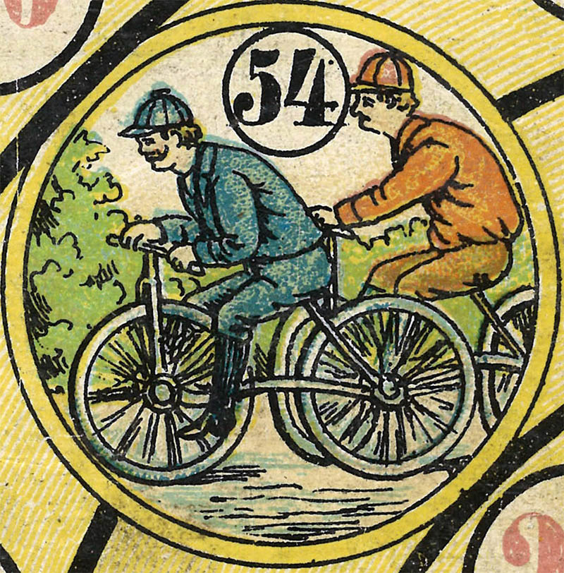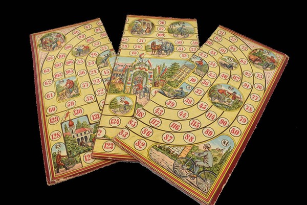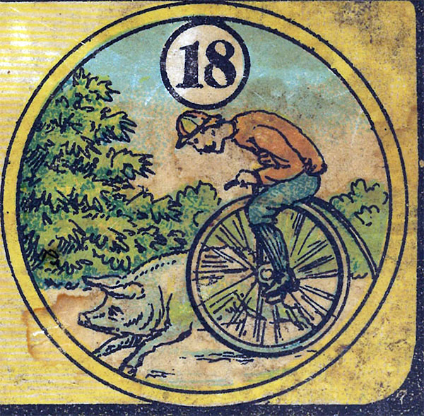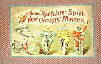 Two-fold German board, measuring 53 x 38 cm. There is at least another version of the game (see below) in which the board is four-fold. This game is an interesting example of how the high wheel bicycles (aka Ordinaries or Penny-Farthings) were replaced by modern bicycles. As I wrote in my comment on this other game, this happened around 1890.