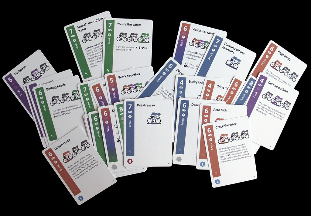 From the game's presentation on Kickstarter: "Your goal is to get your entire team of racers across the finish line in as high a position as possible because your score depends on the aggregate time of your team. But in order to have a shot at it, you must react in the moment, because your opponent's racers will be following your moves, and your racers will be following theirs. Each player draws from their own deck of cards and has the ability to lead (or pull) a line of racers, chase (or follow) the line, draft in between riders (follow AND pull) or make a solo break. It's important to know that every time you move a line of racers, you’ll probably be moving your teammates — as well as your opponents!"