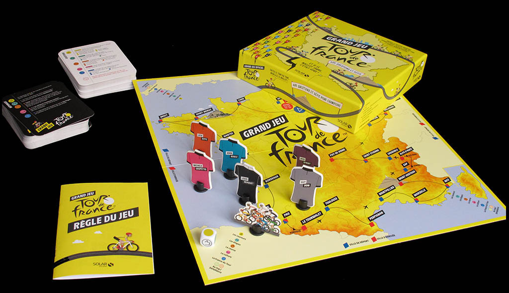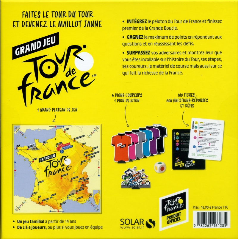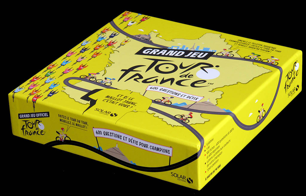 And still another Tour de France quiz game. They probably sell well (or at least some people believe so) since we have had a few in the last years, some of them even with the same exact name. These games are generally signed with the name of a sports journalist who may also have written one or more trivia books on the Tour de France, and their presentation varies from a simple card deck to a fully-fledged boxed game as is the case here.This one even bears the "official" Tour de France stamp on it, which of course just means that it has paid an expensive license to have it.