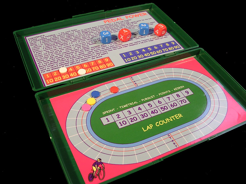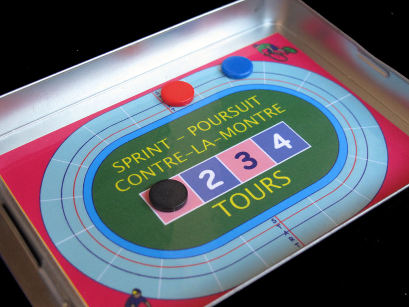 As with most track cycling games, you can play different types of races which, as you can see, are printed on the boards. While the smaller version only offers Sprint, Time Trial and Pursuit, the bigger game adds Points and Keirin races ,