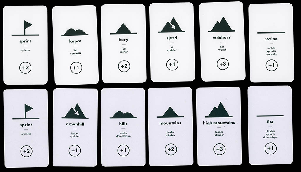 The white terrain cards determine the different nature of the terrain where the race goes. They can only be used to move members of your own team. Each card applies to one or more riders, all of whom gain the number of positions marked on the card. However, if other team riders are placed immediately behind one that gains positions, they benefit from wind protection and also move forward.
