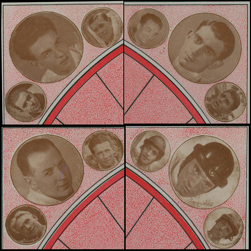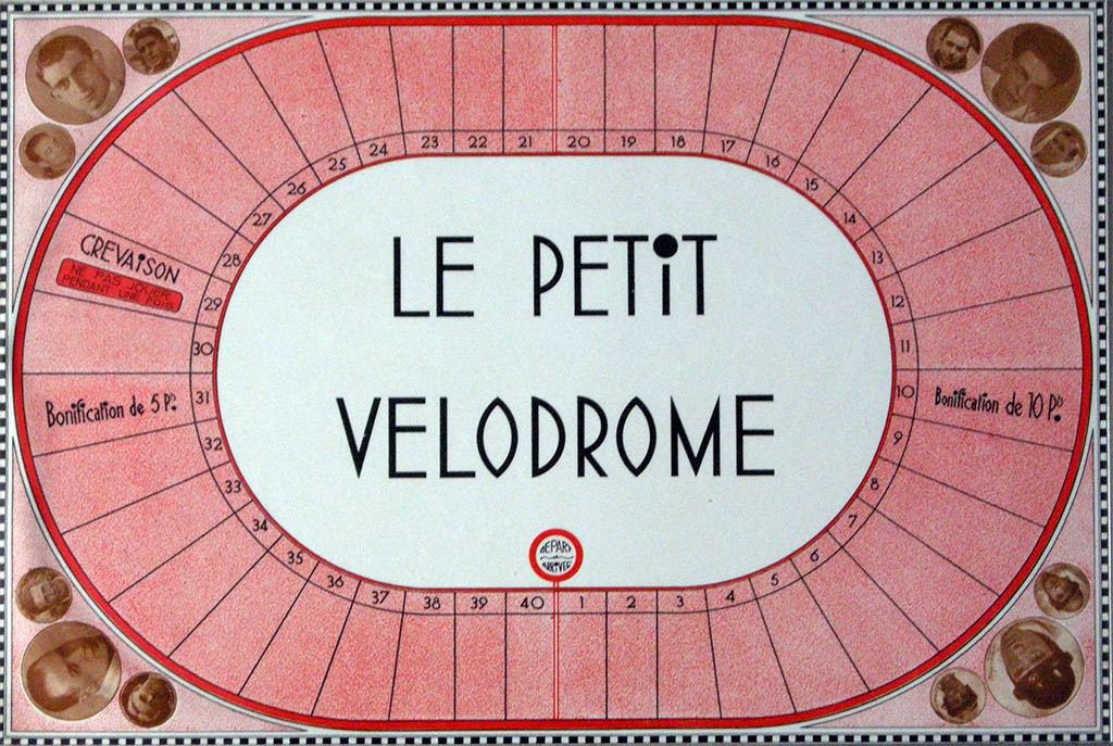 To date this game, our best clue is the set of riders depicted on the corners of the board. Though they have their names written beside the pictures, some are quite hard to read (luckily, they are the same riders in the three velodrome games, and they are easier to read on the bigger boards). Furthermore, while all these riders could have been fairly well-known when the game was produced, most of them are quite forgotten by now. However, I believe I have identified them all.Three of the riders (together in one of the corners of the board) are Tour de France racers Antonin Magne, René Vietto, and Roger Lapébie (unless it is his brother Guy Lapébie, it is hard to tell from the picture).