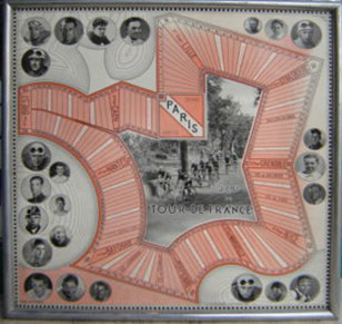 On another corner on the board, we find three specialists in motor-paced cycling races, Charles Lacquehay, Robert Grassin, and Georges Paillard. You can distinguish them by the helmets.
