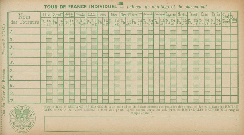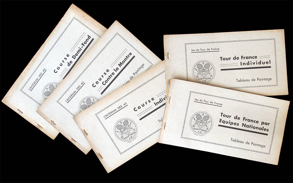On the other hand, Didier has the rules for the Tour de France game, which also has six different races (most of them track races, and not so different from those included in the track game). Of these six games, we only have the scoring pad for two of them.