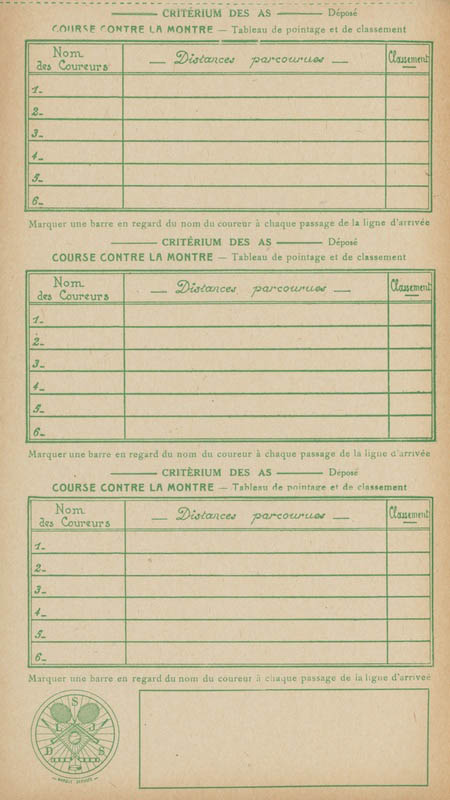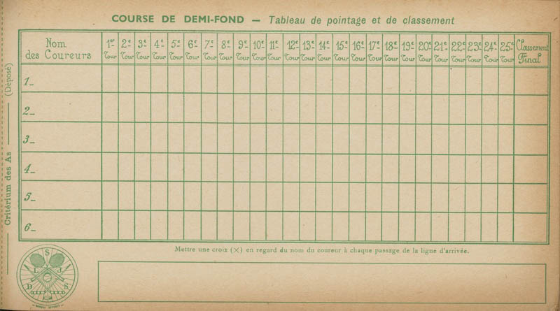 As is usual in track cycling games, different races can be played with it. For want of the rules, we will assume that the six aces stated on the Le Vel d'Hiv board are the ones included in the rules. These races are: elimination race, time trial, individual pursuit, team pursuit, motor-paced race ("demi-fond"), and Madison ("course à l'amériquaine). I guess there was a scoring pad for each of these races, but we only have three of them, and I have never seen the others. By the way, the three are marked "Criterium des As".