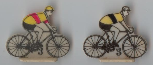 The riders measure 4 cm and are made from a stiff plastic. I am not an expert in plastics, but it can be celluloid. They are not so different from the riders in this other game.