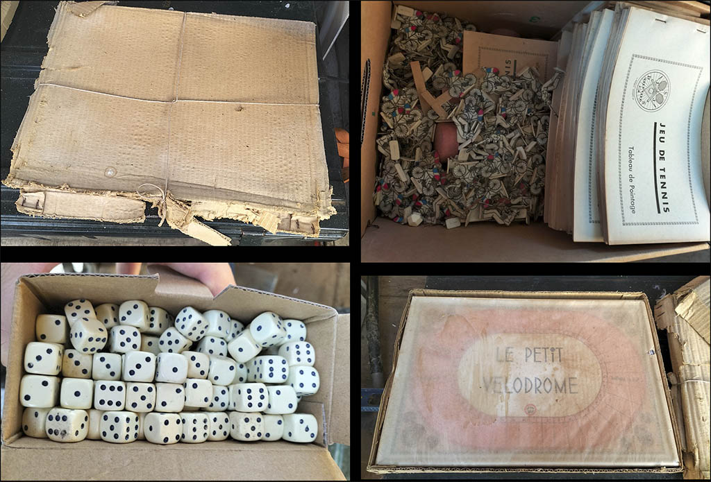 On the other hand, Loïc P recently contacted me saying he had unearthed a trove consisting of some ten "le Petit Vélodrome" boards, still in their probably original plain brown cardboard boxes and paper wrapping, plus other boxes containing various scoring pads, dice, and cyclists (along with some parts belonging to the tennis game). He was kind enough to send me not only the pictures of his finding but also a sample of what he found. Unfortunately, he did not find any rules booklet.
