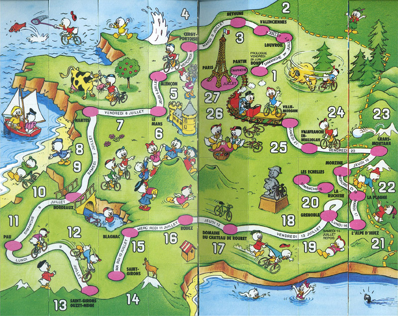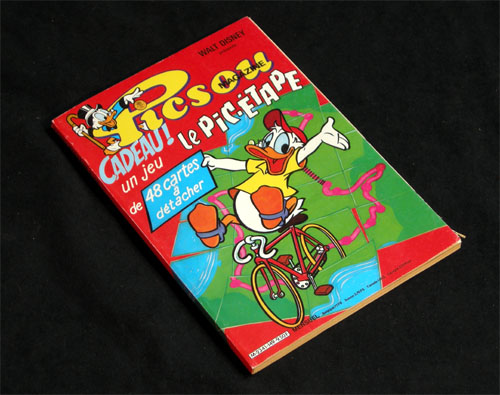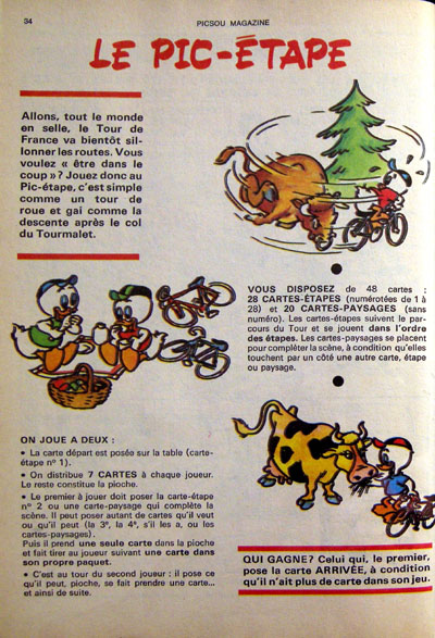 Unusual Tour De France game included with nr. 149 of french Picsou magazine. (One year before the bonus was Picsoutour and, sometime later, Bicross) This one is a 2-player game. It consists of 48 tiles. 28 of them form the road, and must be played in order. The other 20 cards are landscape cards and are placed with one of their sides touching an already placed card.