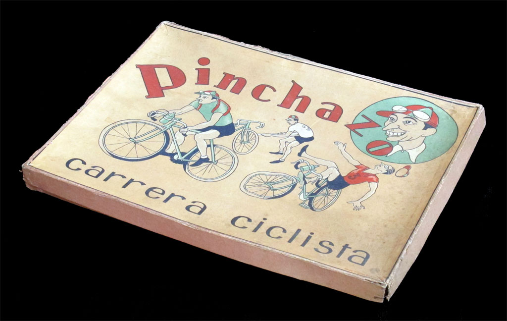 Rare old Spanish game. It represents a race around Spain, but it is not called "Vuelta a Espaņa", as one might expect, but "Pinchazo", which means "puncture". The name is quite odd. I can think of some reasons for it, but the most obvious is that this game may be previous to the Vuelta. One must remember that the Vuelta only started in 1935 (much later than the Tour, the Giro or even the Volta a Catalunya)