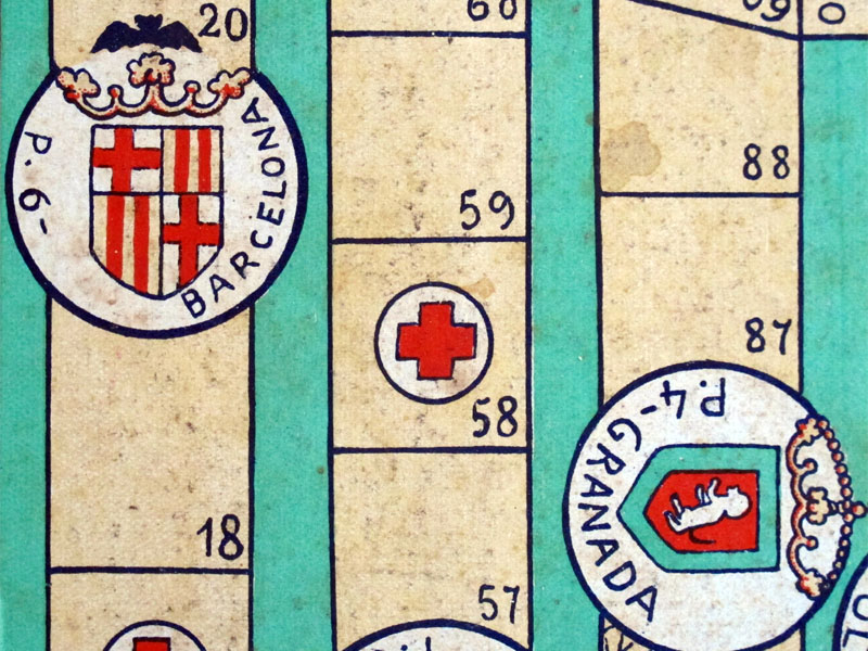 However, I cannot date the game with precision. The cities in the board do not match any edition of la Vuelta (why should they if the game is not called "la Vuelta"?), and the pennants which represent the cities are not historically accurate and mix elements from different decades. Specifically, the Barcelona pennant still has the bat (which disappeared from the offical pennant in 1931) but, on the other hand, has just two red bars on each quarter, which might mean that the game is post-war (btw, "post-war" in Spain means post the civil war, 1936-39, since Spain did not take part in WWII).