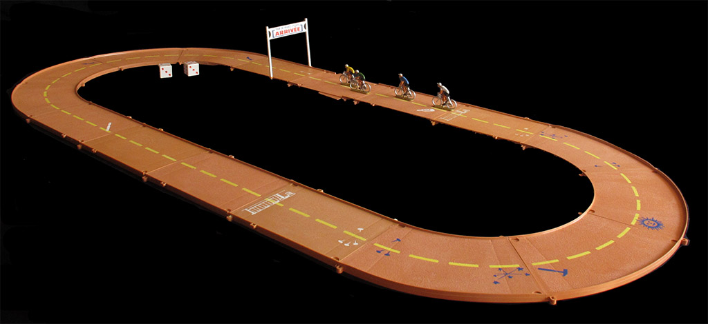 For all its beauty, the game is disappointingly simple. It is just a childish roll-and.move game without any tactical twist. The game fields are the dashes on the road (maybe the first game to implement them this way). During the climbs you subtract two to the throw of the dice, during the descents you add two, and that's all there is to it. The race incidents are equally simple: go some fields back or miss some turns.