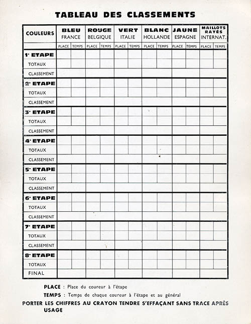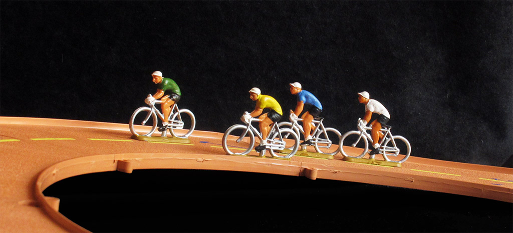 What I am not so sure is that you would have six riders in different colours. I have never seen the rider with the striped jersey ("maillot rayé") mentioned in the table. All the boxes I have seen contain a red, a blue, and a yellow rider, with the fourth rider either green or white. Didier's box has both, but still no striped rider.