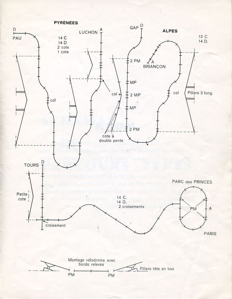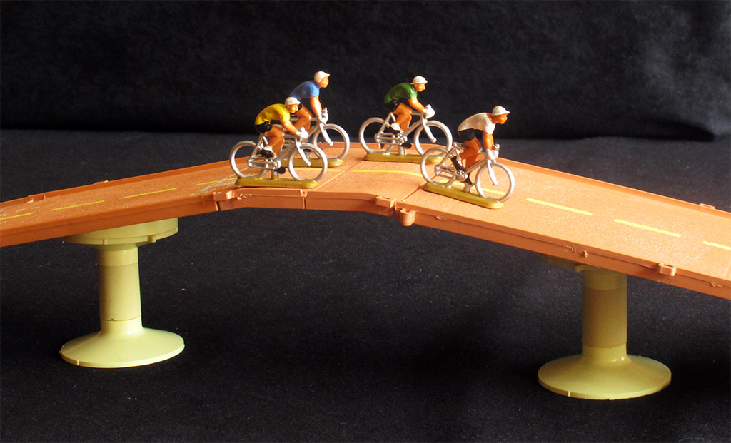Furthermore, as we have seen above, the rules (again, in all the boxes) include settings for stages with 14 curves, 14 straights plus two crosses, &c, which cannot be built with the contents of any single box, not even the big one. In the end you had to buy two boxes if you wanted to build all the stages described in the rules. And in this case you would have -at least- 8 riders.