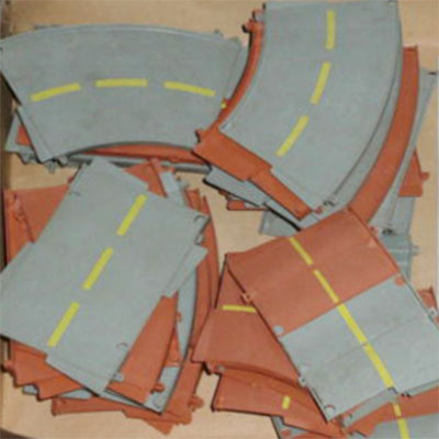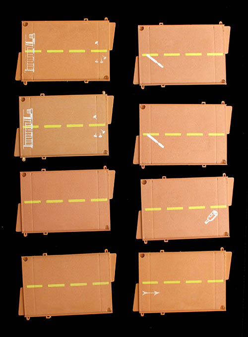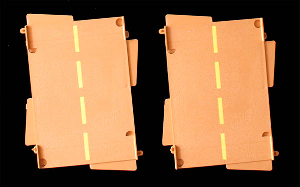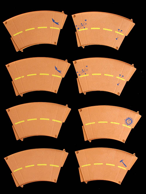 The game includes implements to build mountains and hills. Instead of having some kind of mark on the road or a different colour, we find here the supports you see above with which you can elevate the road. You can also cant the curves with them. The smaller road pieces are curved to make the transitions smooth. The piece on the left ins placed between the flat part of the road and the mountain, while a couple of pieces like the one on the right make the mountain (or hill) top. There are four of each of these pieces in the box.