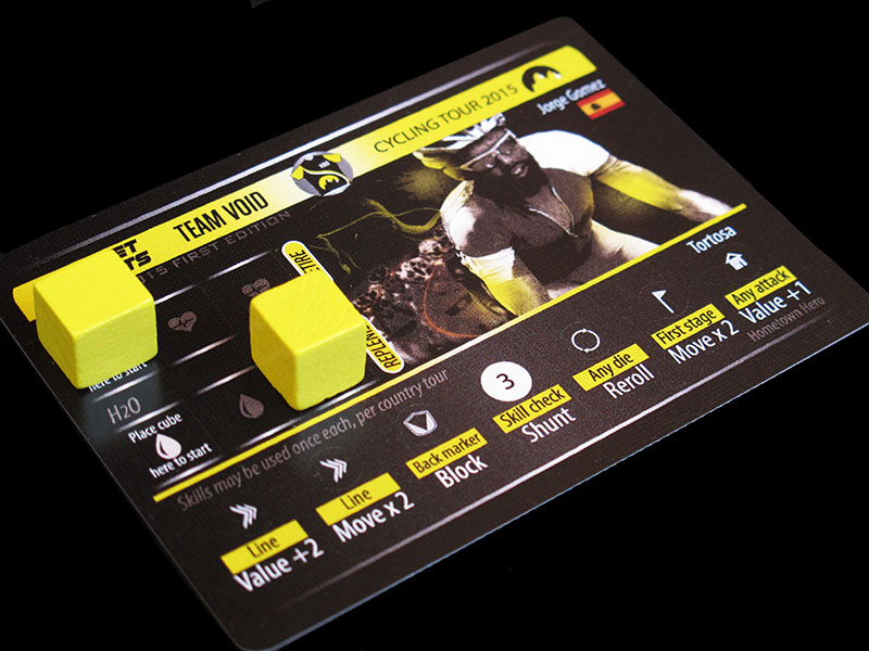 Inside the card-deck-sized box (it really fits in your pocket) you will find six different colour-coded dice, four team cards, a leader board, twelve wooden tokens, the rules and the list of stages. "Pocket Sports" honours its name.