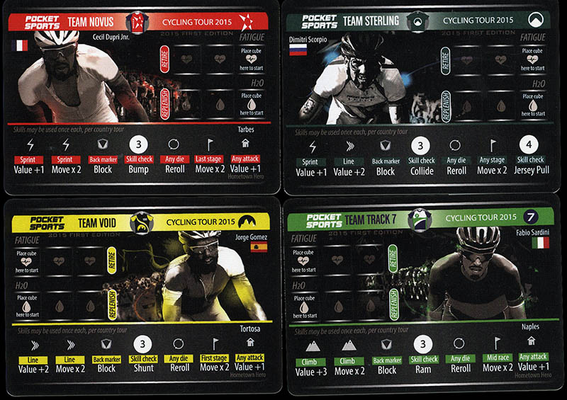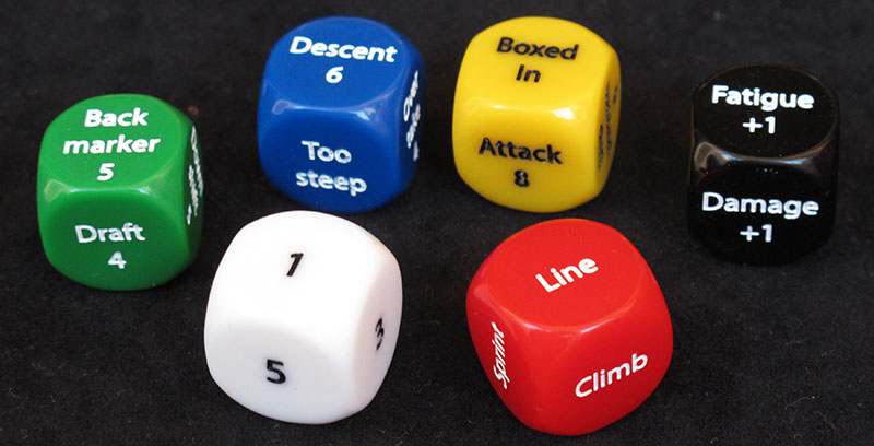 Small game from Australia belonging to a large collection of dice-based sports games devised by Hamish Sterling. According to Hamish himself, "Pocket Sports Cycling is a simple dice rolling game that lets you take the handlebars of a rider in a cycling event". This game, which can be played in solo mode or up to 4 players, is supposed to consist of a Grand Tour that takes place accross 3 different countries with 42 stages. But then Hamish is the first to concede that he is not a big cycling fan. As I see it, this game represents a three-stage race with a short time-trial prologue. Seen this way, the game is almost realistic.