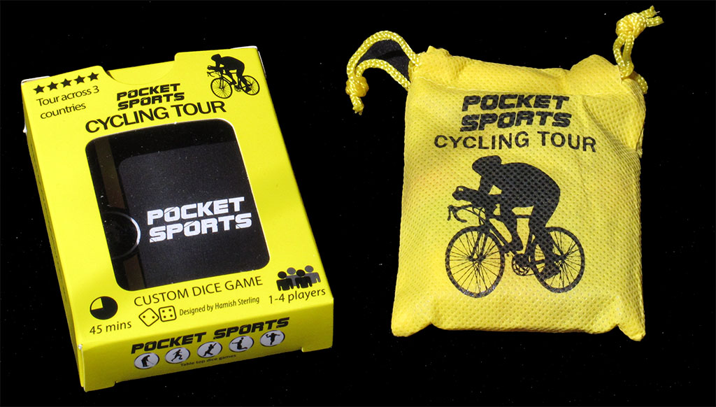 Most of the Pocket Sports games vame in a nice cloth bag, but unfortunately the cycling game did not. Now this has been solved and you can purchase the bag (separately, I am afraid). Unfortunately, not all the contents of the box fit in the bag. The dice and counters do, but not the cards: you still need the box to store the game in.
