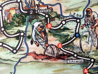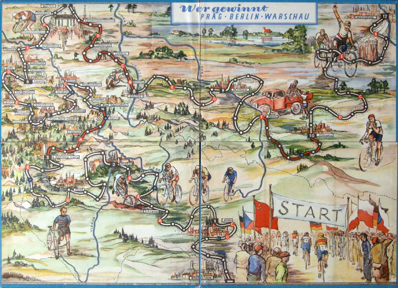 The race begins in Bratislava and ends in Warsaw (as did the 1953 edition of the race). It is divided in 12 stages. The game is played with 3 dice. The first rider to reach the even stages receives 5 points, and the second receives three points. For odd stages there are only 3 points awarded to the first rider to pass the city and one point for the second.