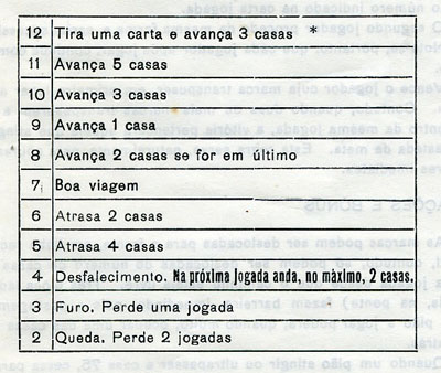 Riders stopping on one of the darker (yellow) fields must throw two dice and refer to a chance table in which numbers 8-12 are positive while numbers 2-6 are negative. (Translation: upon throwing 12 you reject a card -one you don't need-, advance three fields and you draw another card to complete your hand).