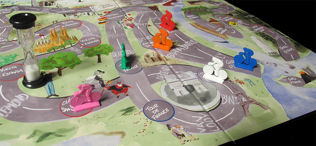 The open board measures 48x48 cm and represents a cycling season. The races are ordered chronologically, according to their order in the cycling calendar, and when two races are simultaneous (for instance, Paris-Nice and Tirreno-Adriatico) there are two paths that you can choose. On the other hand, the three-week tours have three fields each.