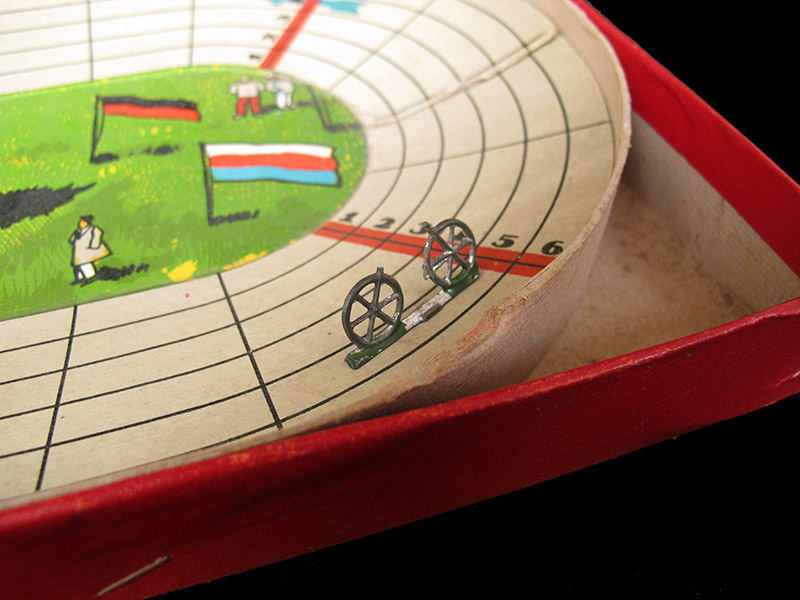 Inside the box I received the remains of three metal cyclists. I have not repaired them yet, but they are almost complete. I do not know if they belong to the game, since they do not look like velodrome riders in the first place. In fact, they look older than the rest of the game (even accounting for the game being from the 1910s).