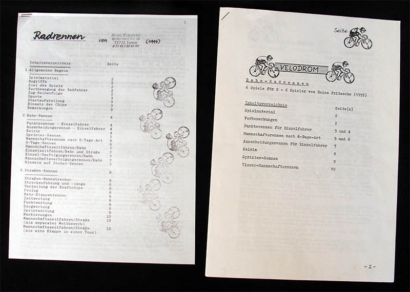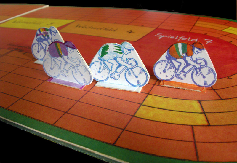 Unpublished prototype found by my friend François Cardinet at the Essen game fair, inside the box of a football game called "Ausgetrickst...", with which it shares some elements. It is a quite elaborate and complex game which I have not studied in depth yet. It features rules for both road and track cycling, and four double sided boards to design different races,