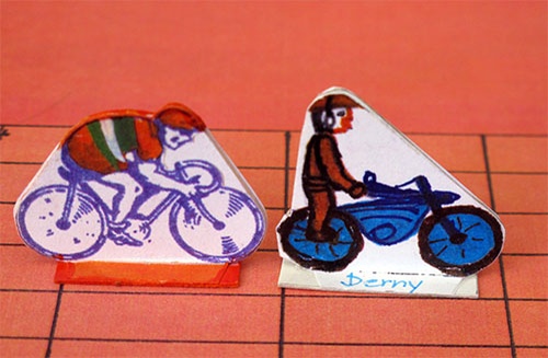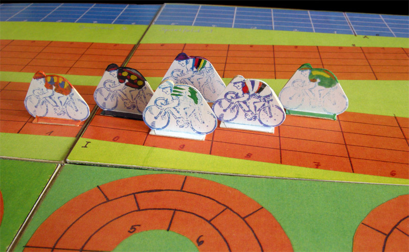 I also have a derny (which I do not recall being in François' game, but is -probably- needed for the Keirin race) and the couple of riders on the left picture, which were in the box, but I don't think they belong to the game.