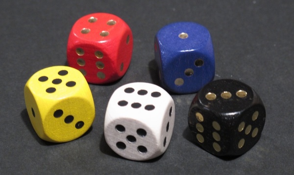 Five (wooden) coloured regular D6 in my velodrome-only version of the game