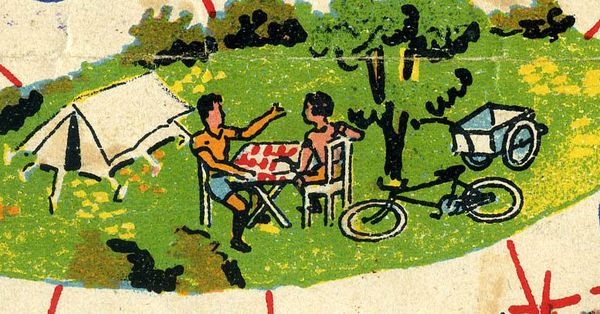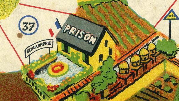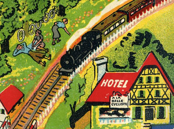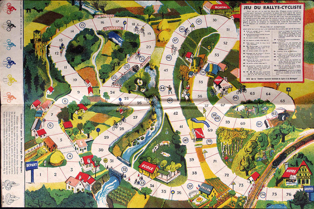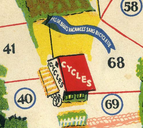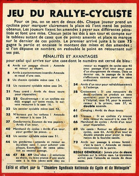 Promotional game of goose offered by the Chambre Syndicale du Cycle et du Motocycle. It is made of light cardboard and measures 54 x 36 cms. It is quite difficult to fins this game complete with the riders (as they have been generally cut) and even more with the original envelope. (By the way, I have one in such condition for trade).