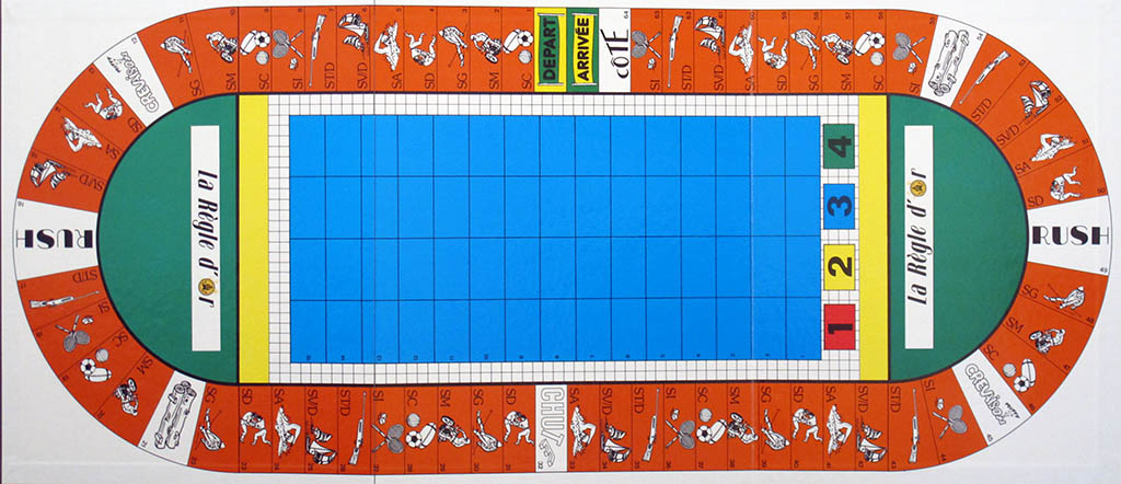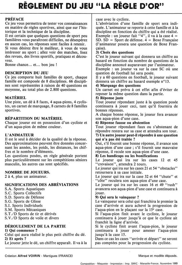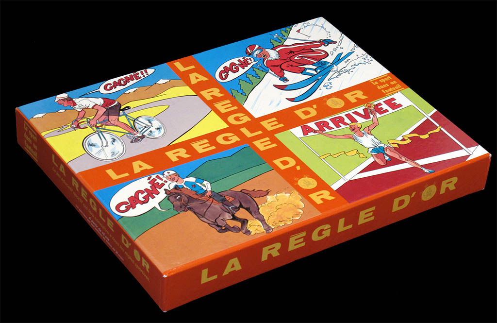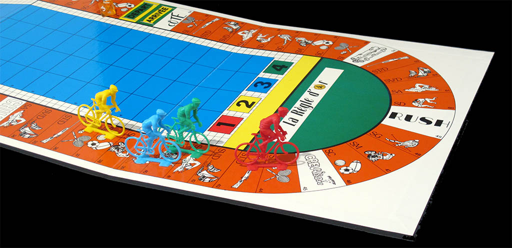 This game is hard to describe as "a cycling game", It is a sports quiz game, in which cycling is just one of the 64 (!) sports included. If I have included it in the collection is because it has cyclist-shaped figurines, and therefore it may look like a cycling game at first sight. However, the cyclists are not really racing each other (this is left for the swimmer tokens, the game is rather a swimming race game) but only determine the type of question you are going to be asked.