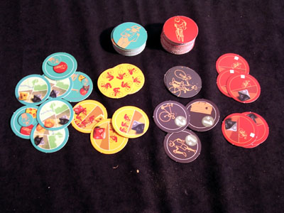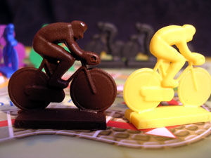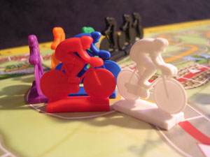 The most interesting (at least, unusual) rule is the presence of a peloton. It consists of three riders glued together on a small plate (see pics). This peloton generally moves automatically (following the last cyclist in the race) but can accelerate by playing some tactical cards (riders in front of the peloton also speed up), or overtake cyclists who had to skip one turn. If a rider is overtaken by the pack, he is in trouble..