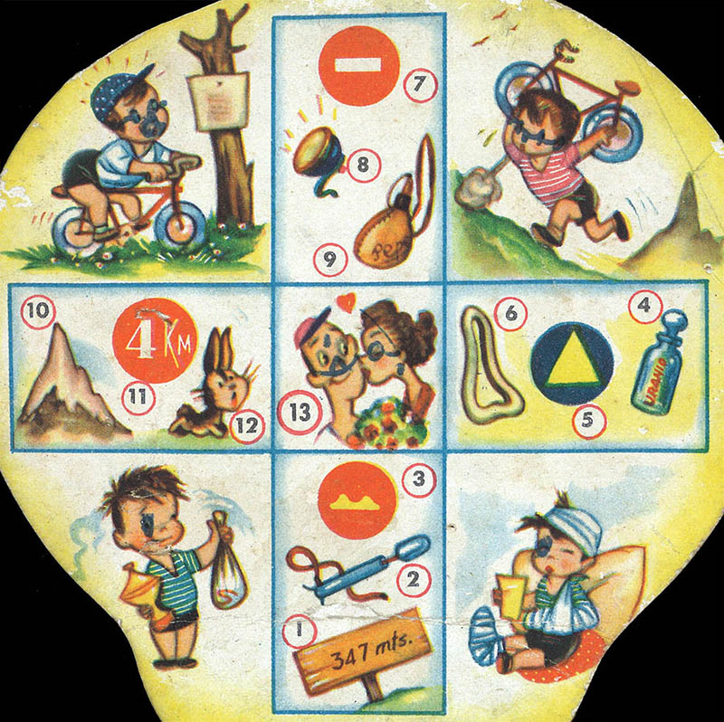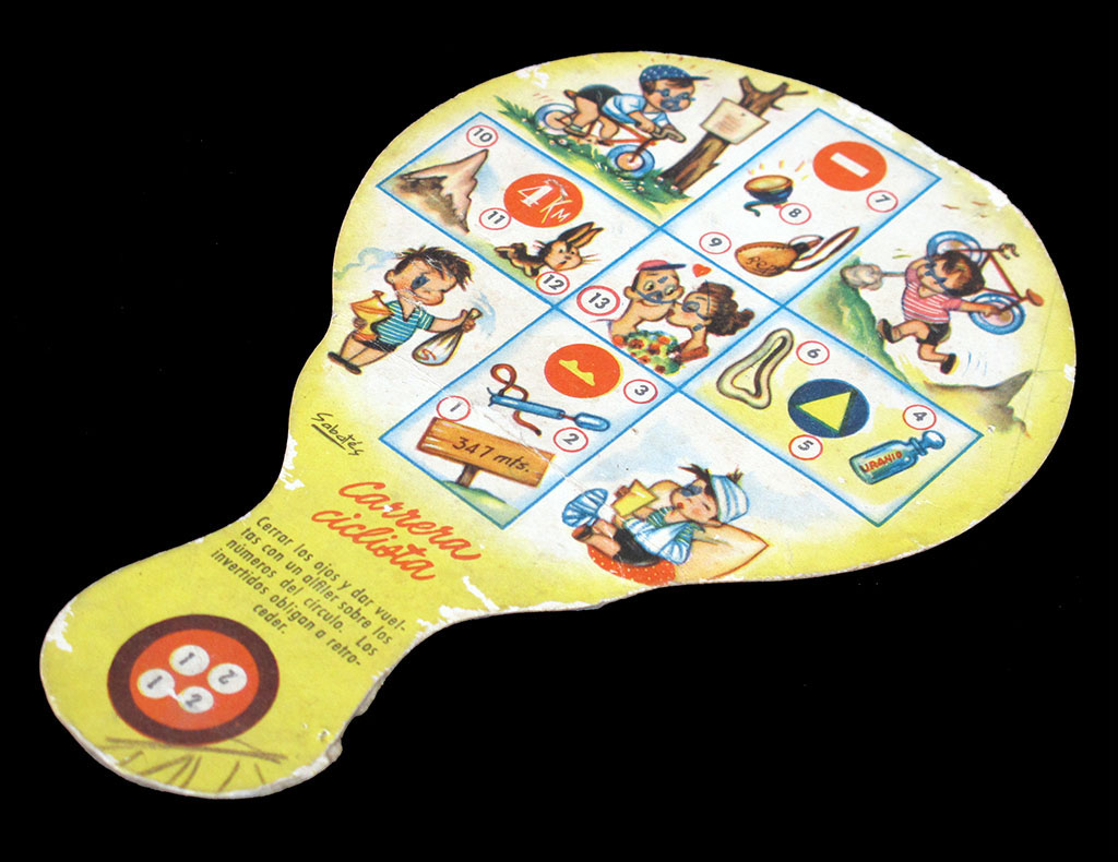 This rare children's game is printed on a small (17 x 12 cms) paper fan, a promotional item for a store in La Línea de la Concepción. By the way, these oriental-style rigid fans with a handle are called "paipay" (or "paipái") in Spain.