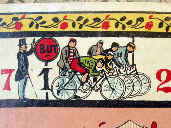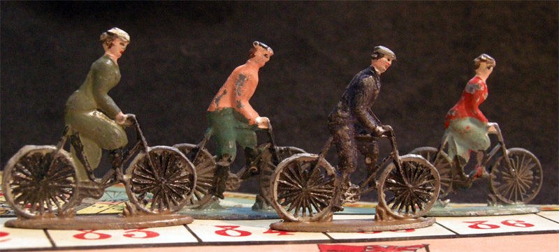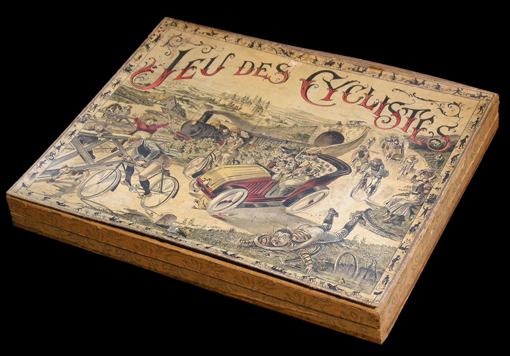 Notice that the inscription on the board does not say "Jeu des Cyclistes" but "Jeu des Touristes et du Vélodrome". There is also a pre-WWI version of the game called "Jeu des Touristes", and of course the older "Nos Cyclistes à travers la France et la Belgique et Jeu de Vélodrome", which has a quite different board.