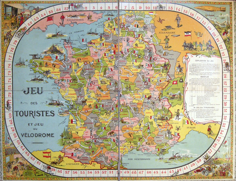 Classic French game of which there have been many different editions, some of which as late as the 1950s (see Nos Cyclistes à Travers la France et la Belgique, Jeu des Touristes and Tour de France Cycliste /Grand Rallye Touristique). This is one of the early editions, as you can see by the pre-WWI borders and by the German flag.